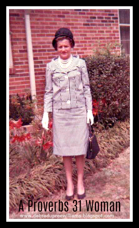 When I think about the Proverbs 31 woman, I always think about my Mama, especially the verses about rising early, making garments, and speaking words of wisdom. Sis and I were blessed to have a hard-working, I-can-do-anything, service-oriented woman as our Mama. She may not have been perfect, but she did her best, and that is all that is required of us. I can say that when I go home to be with Jesus, I hope my children think of me when they read that chapter.