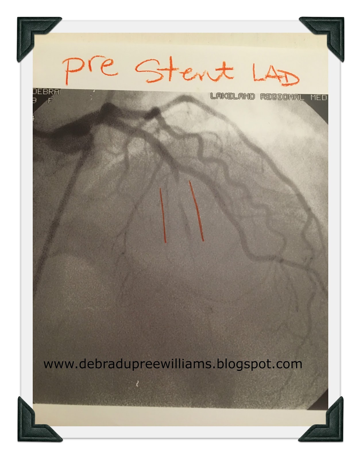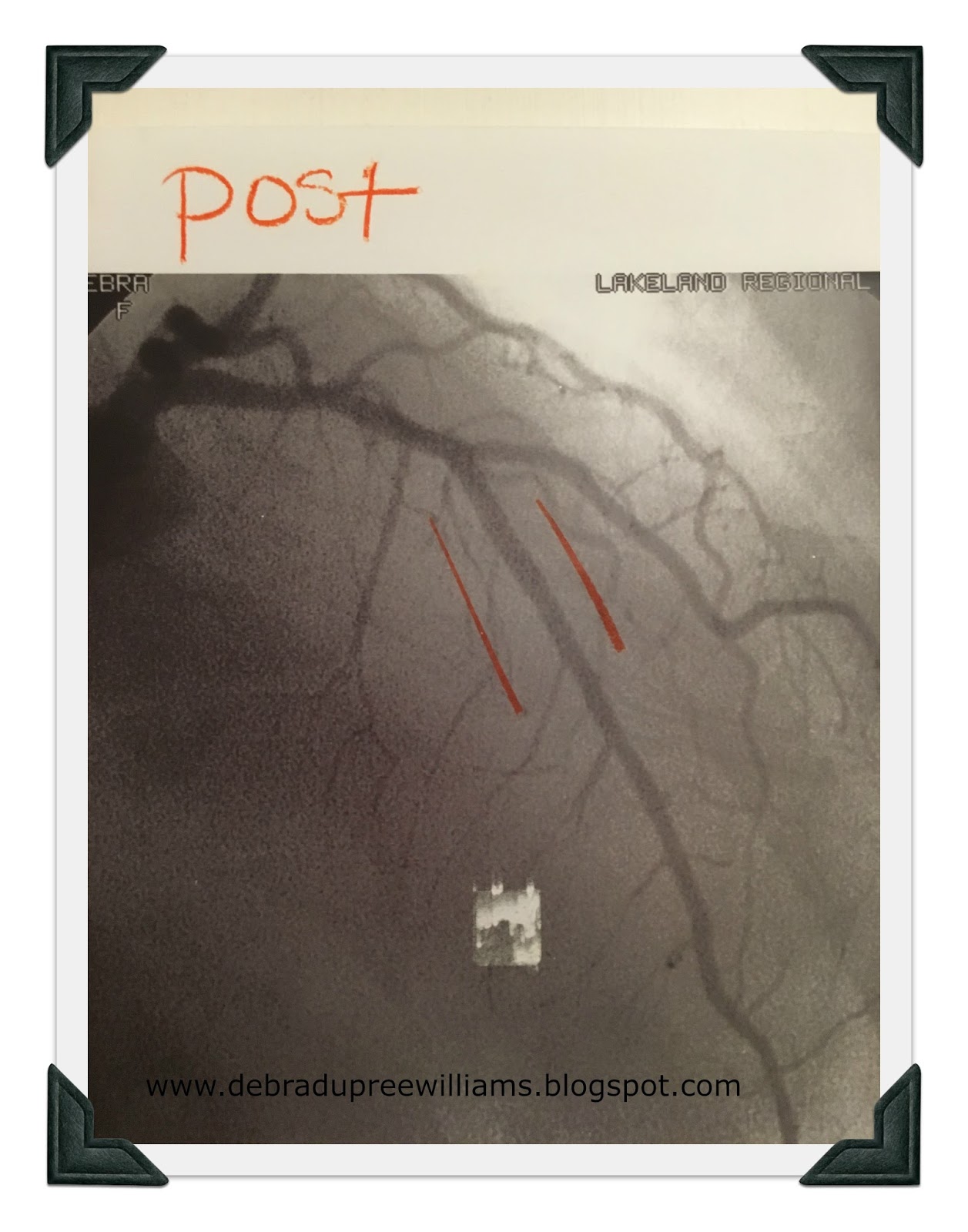 After I had received the stent and recovered sufficiently for the doctor to talk to us, he showed us before and after x-rays. By the grace of God alone, I had a tiny little blood vessel that had formed its own bypass around the clogged artery, the main one on the front of the heart, the Left Anterior Descending, the LAD, also known as the widow-maker. It was 99.9% blocked. But I was still alive!
